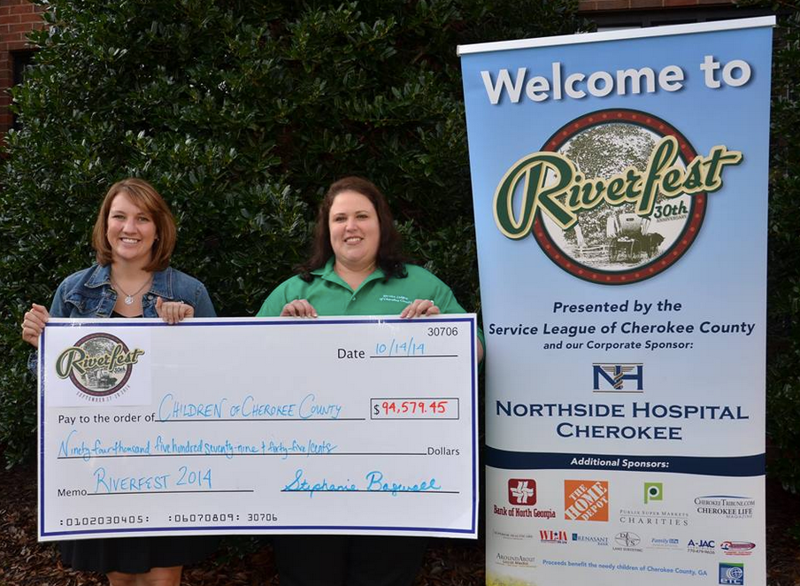 The Service League of Cherokee County on Tuesday celebrated a banner day as President Melissa Whatley accepted a check from the 2014 Riverfest Committee in the amount of $94,579.45.