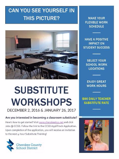 To apply, visit www.cherokeek12.net, click Jobs @ CCSD and complete an AppliTrack application; applicants will receive an invitation to the next training workshop, which is on Dec. 2.