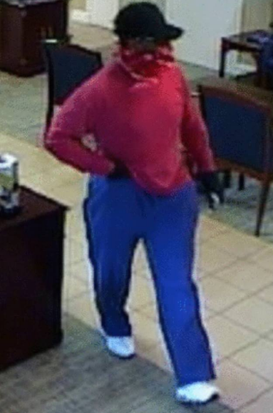 The suspect is described as a black male wearing blue pants, a red long-sleeved shirt, white athletic shoes, a black ball cap, gloves and a red bandana over his face. He was last seen running away from the bank near the old Ryan's building located next to the bank.