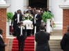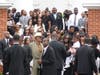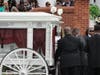 A trumpet player performed "Jesus Loves Me" as the casket was carried down the long staircase in front of the church. Hundreds gathered around to show their support to the family.