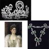 The tiara dates back to about 1900, created by Bolin, and is encrusted with diamonds and stunning Colombian emeralds. The tiara features light, whimsical bows and flourishes, which were very popular in the Edwardian Era during the early twentieth century. Bodarevsky painted her in this tiara in 1907. Fabergé made a stunning devant-de-corsage brooch to match the tiara.