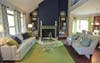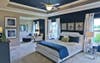 Angela Cain’s task was to merchandise all 2398 square feet of the 3 BD/3BA Burton floor plan. She chose to appeal mainly to an empty nester buyer with a serene overall color scheme that comprises shades of royal blue and navy, alongside taupes, grays and lime green. Rather than utilize the optional bedroom at the front of the home as such, Cain merchandised it as a home office furnished with industrial styled furniture pieces for a clean, fresh and casual look. In the living area, she elected to accentuate the fireplace wall and the vaulted ceiling by painting the wall navy blue and the mantle a medium gray. She then flanked the fireplace with a pair of unique bleached wood and mirror bookcases.