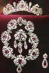 This delightful tiara is part of a pink tourmaline parure, all owned by the Savoy family. It was originally made for Queen Maria Theresa of Sardinia, a member of the Tuscan branch of the Habsburg family who died in 1855. The tiara passed to her son, who died leaving it to his wife, Princess Elisabeth of Saxony. She then passed the tiara on to her daughter, Margherita of Savoy, who married King Umberto I of Italy, and the tiara has remained in the Italian collection ever since. Its most famous appearance in recent years was in 2003 for the wedding of Emanuele Filiberto, to French actress Clothilde Courau.