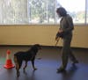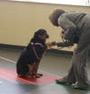 The newly adopted Gigi came back to the shelter for her opportunity to shine. Though marked with some Rottweiller coloring, there is also a good bit of Border-Collie intensity to Gigi. Walking into the room through the door, she was perfectly attuned to her trainer, Jorie Stephens. Stephens, who met Bruce when she trained her own dog through the Academy, says that Gigi has also been at the shelter since August. “No one even asked to see her” during the months that she was there.