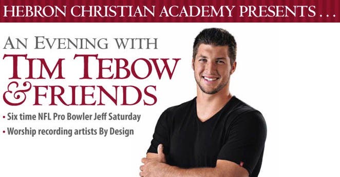 "An Evening with Tim Tebow and Friends," presented by Hebron Christian Academy, is scheduled Friday night at Hebron Church's Worship Center.