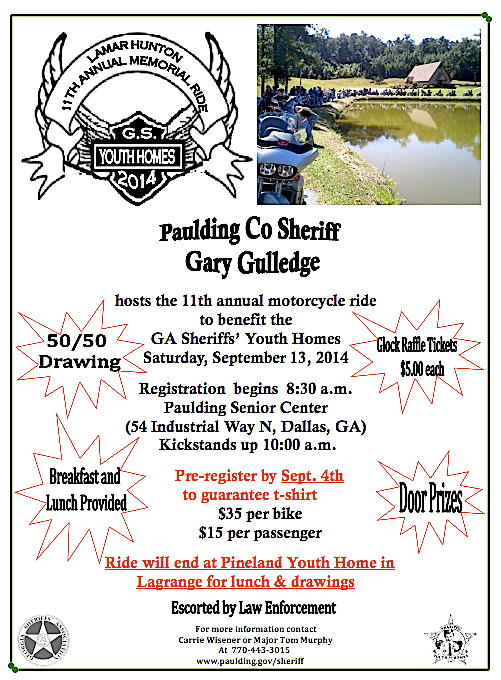 Paulding County Sheriff Gary Gulledge is hosting the 11th Annual Lamar Hunton Memorial Motorcycle Ride to benefit the Georgia Sheriffs’ Association Youth Homes on September 13.