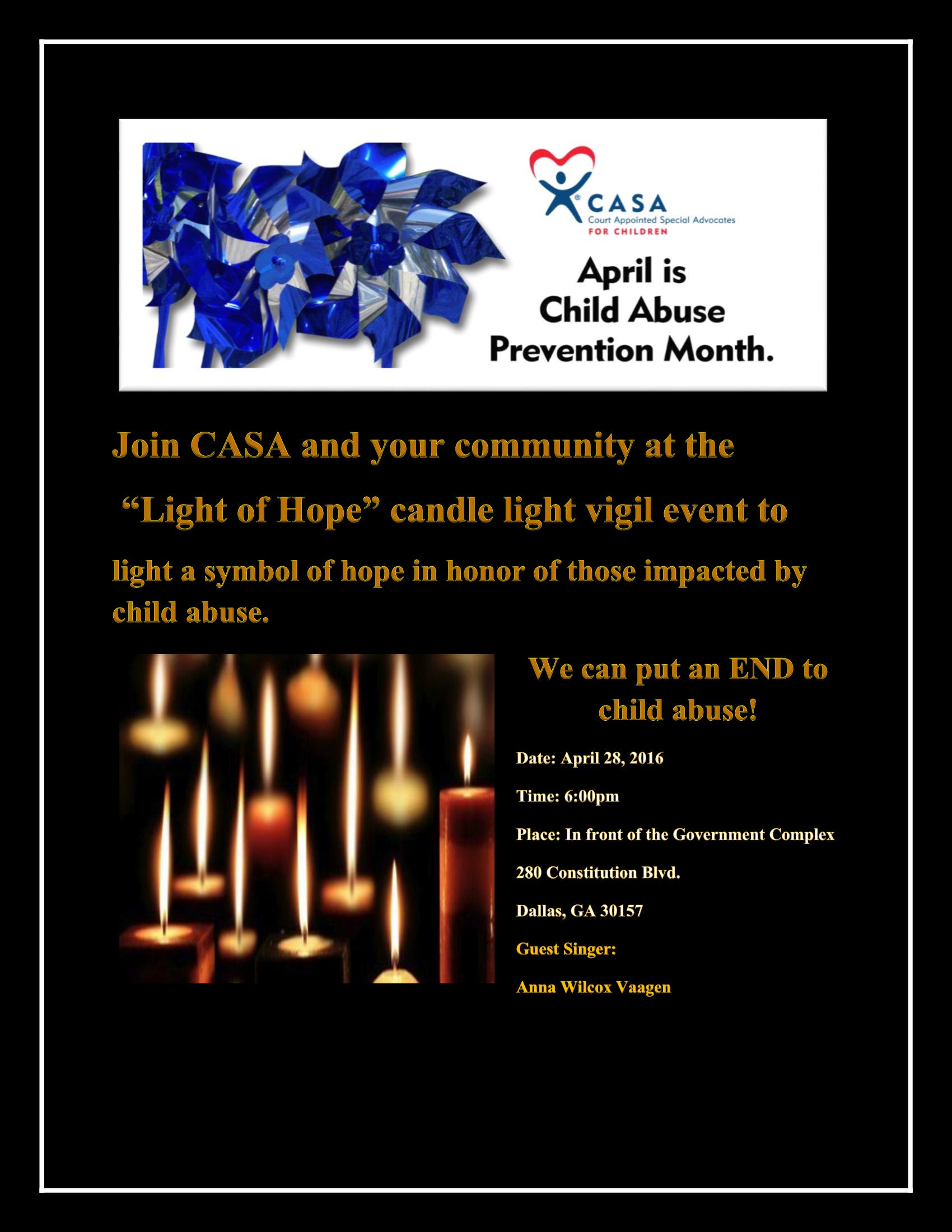 April is National Child Abuse Prevention and Awareness Month and is recognized by the National CASA Association by hosting a “Light of Hope” candlelight event across the nation. The vigil is part of a national movement to light a symbol of hope for abused and neglected children. On Thursday, April 28, 2016 at 6:00pm, the Court Appointed Special Advocates (CASA) is sponsoring a Candlelight Vigil on front of the Watson Government Complex at the Pavilion of Veterans Park. The public is invited to attend.