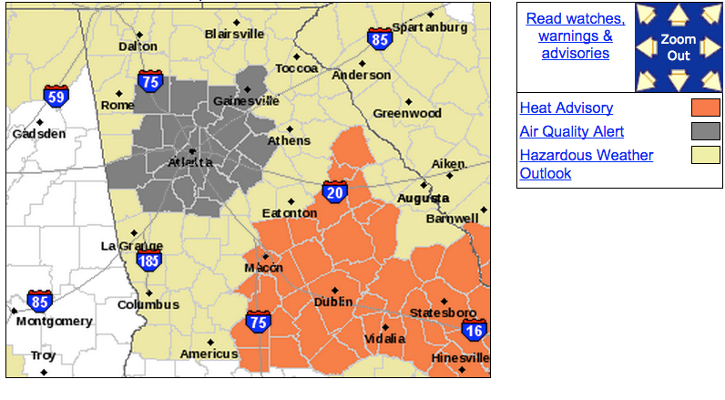 Image: National Weather Service map showing air quality alert (gray) and heat advisory (red)