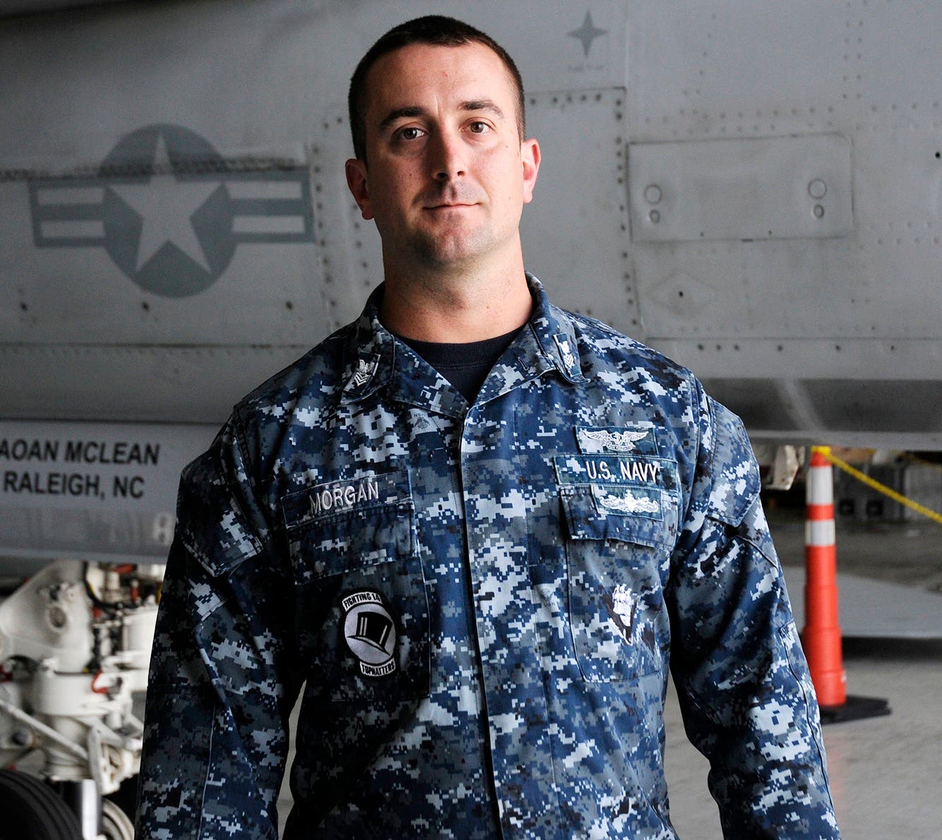 Petty Officer 1st Class Christopher Morgan is an aviation ordnanceman with the squadron, which the Navy designates as VFA-14, and works with the Navy’s most lethal and versatile strike fighter aircraft, the F/A-18E Super Hornet.