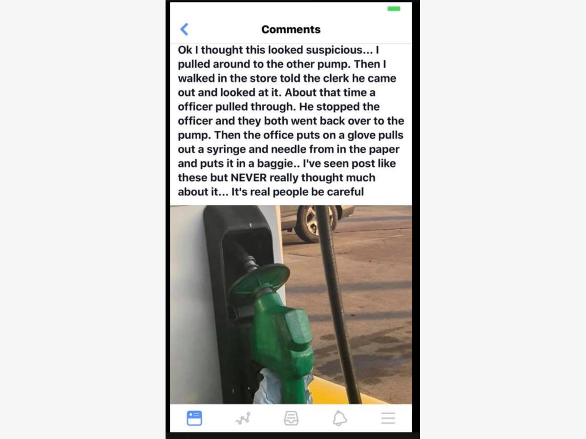 "OK, I thought this looked suspicious...I pulled around to the other pump. And then I walked in the store told the clerk he came out and looked at it. At that time a officer pulled through. He stopped the officer and they both went back over to the pump. Then the office[er] puts on a glove pulls out a syringe and needle and puts it in a baggie.. I've seen post like these but NEVER really thought much about it... It's real people be careful."The post has since been deleted and the original publisher has failed to respond to a request for more information.