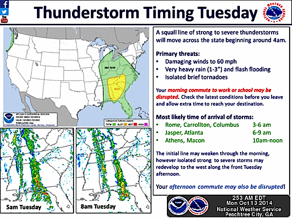 The National Weather Service says Tuesday’s morning and afternoon commutes around metro Atlanta will likely be impacted by severe weather.