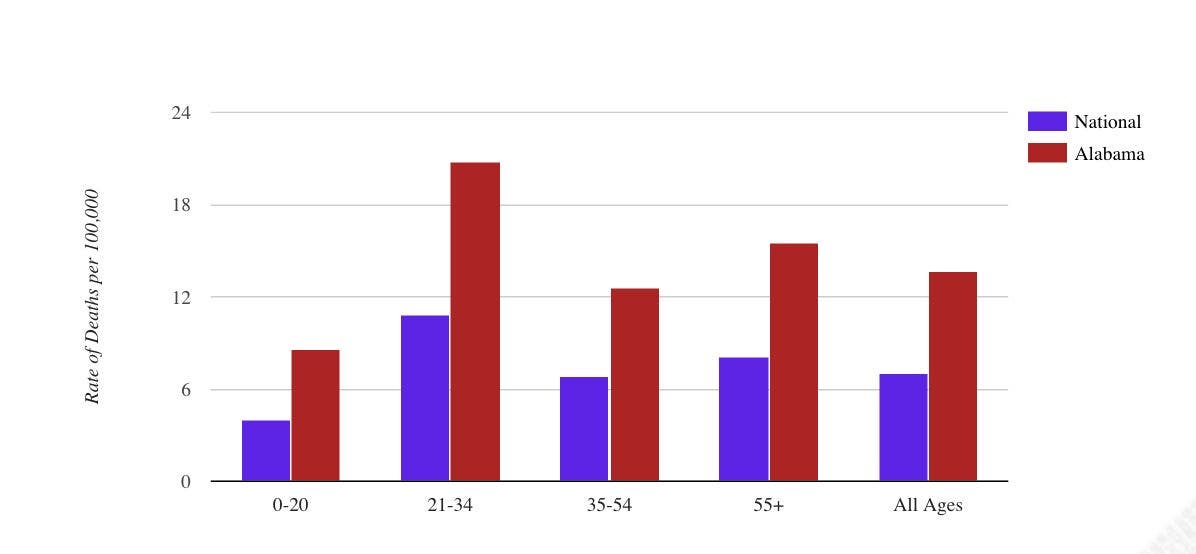Hopefully, the one in three don’t reside in one of the eight counties with no hospital at all. ADPH compares mortality rates slightly different than the CDC. They include all persons killed in a car accident as opposed to just car passengers- for Alabama, they found the average rate of death was 19 per 100,000 people between 2011 and 2013. Using the ADPH’s formula, the national average for the same time frame was 11. Lowndes County, with no hospital and an hour and a half from Montgomery, has a accident fatality rate of 55; adjacent Wilcox County is 55 per 100,000, five times the national average.