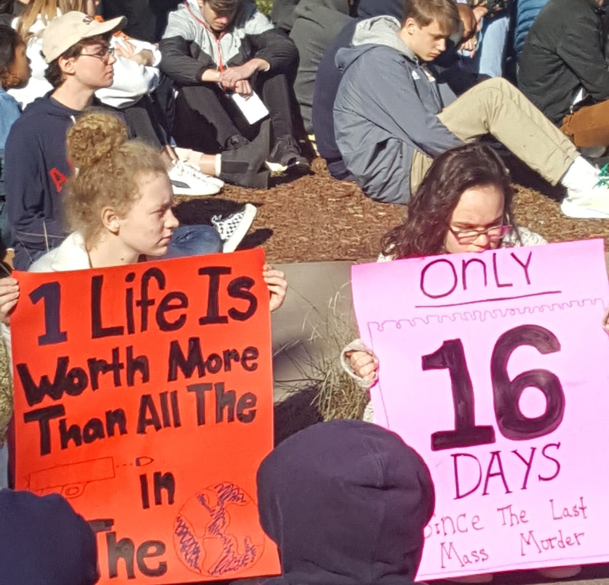 In Decatur, students followed a couple of speakers with 17 minutes of silence. At the start of each minute, a student read aloud the name of one of the 17 people killed at Marjory Stoneman Douglas High School last month.