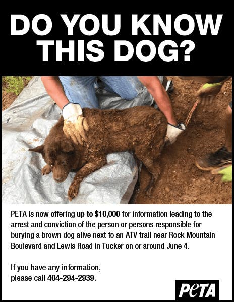 "Someone tortured this dog by packing her in dirt, where she couldn’t move, drink, or escape the terror of being buried alive," said PETA's O’Brien. "PETA urges anyone with information about this case to come forward immediately so that whoever buried this dog can be held responsible and stopped from hurting anyone else."