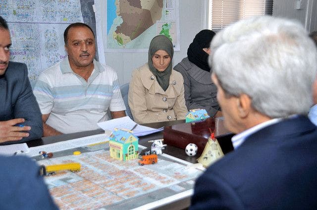 A Syrian refugee, who was not identified by name, speaks to U.S. Secretary of State John Kerry as he visits the Za'atri Refugee Camp in Jordan on July 18, 2013. [State Department photo/ Public Domain]