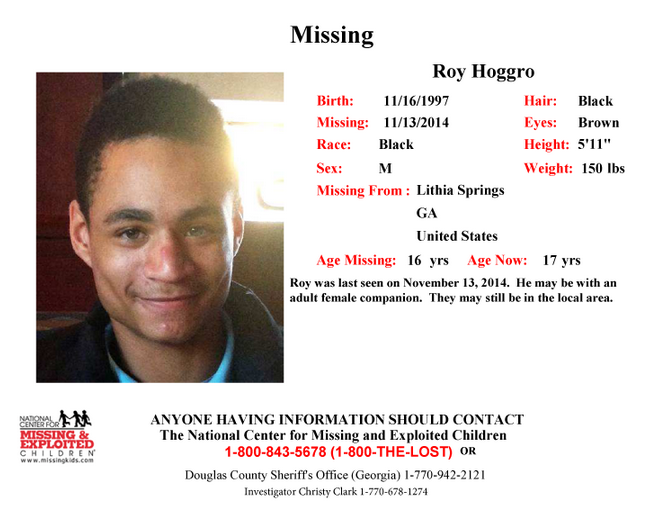 The agency posted on Facebook and in a news release Roy Hoggro, 17, was last seen in Cobb County on Nov. 13, 2014, possibly with a woman companion.