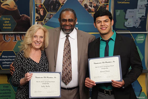 Photo: GreyStone Power Foundation, Inc. Chairman of the Board Marcus Carter, center, presents the Tim B. Clower Scholarship for $2,500 each to Chattahoochee Technical College students Sally Wells and Abisai Perez. The scholarships are funded by members who choose to round up their power bill to the next dollar each month through GreyStone’s Operation Round Up program.