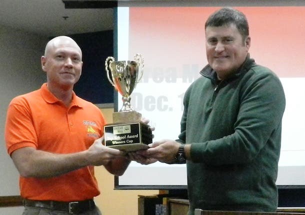 Photo: Principal William Marchant happily receives the trophy from campaign Director George Chip, Director of Student Support and Athletics.