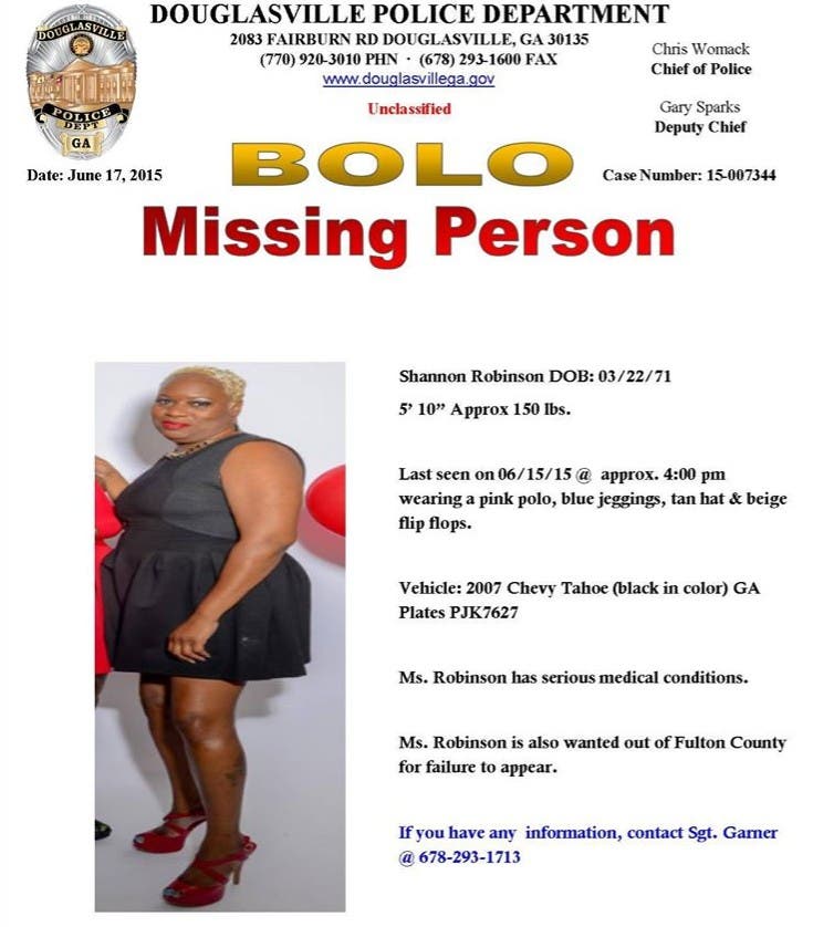 Police say Shannon Robinson, 44, has serious medical conditions, and is also wanted out of Fulton County for failure to appear.