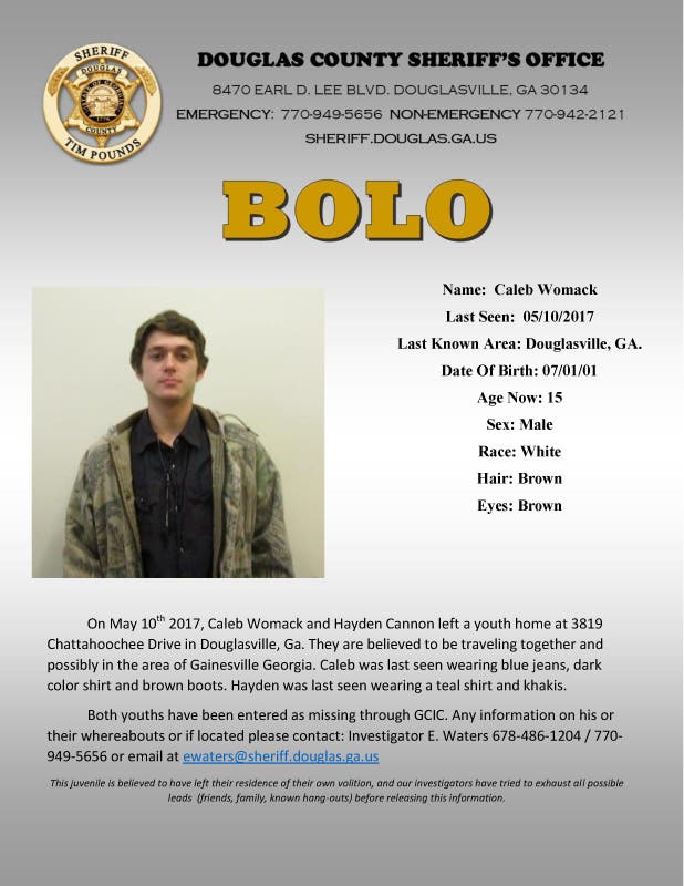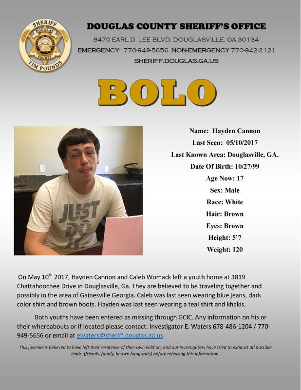 Hayden Cannon, 17, and Caleb Womack, 15, were last seen on May 10 at a youth home in Douglasville. The two are believed to have left the home, at 3819 Chattahoochee Dr., together.
