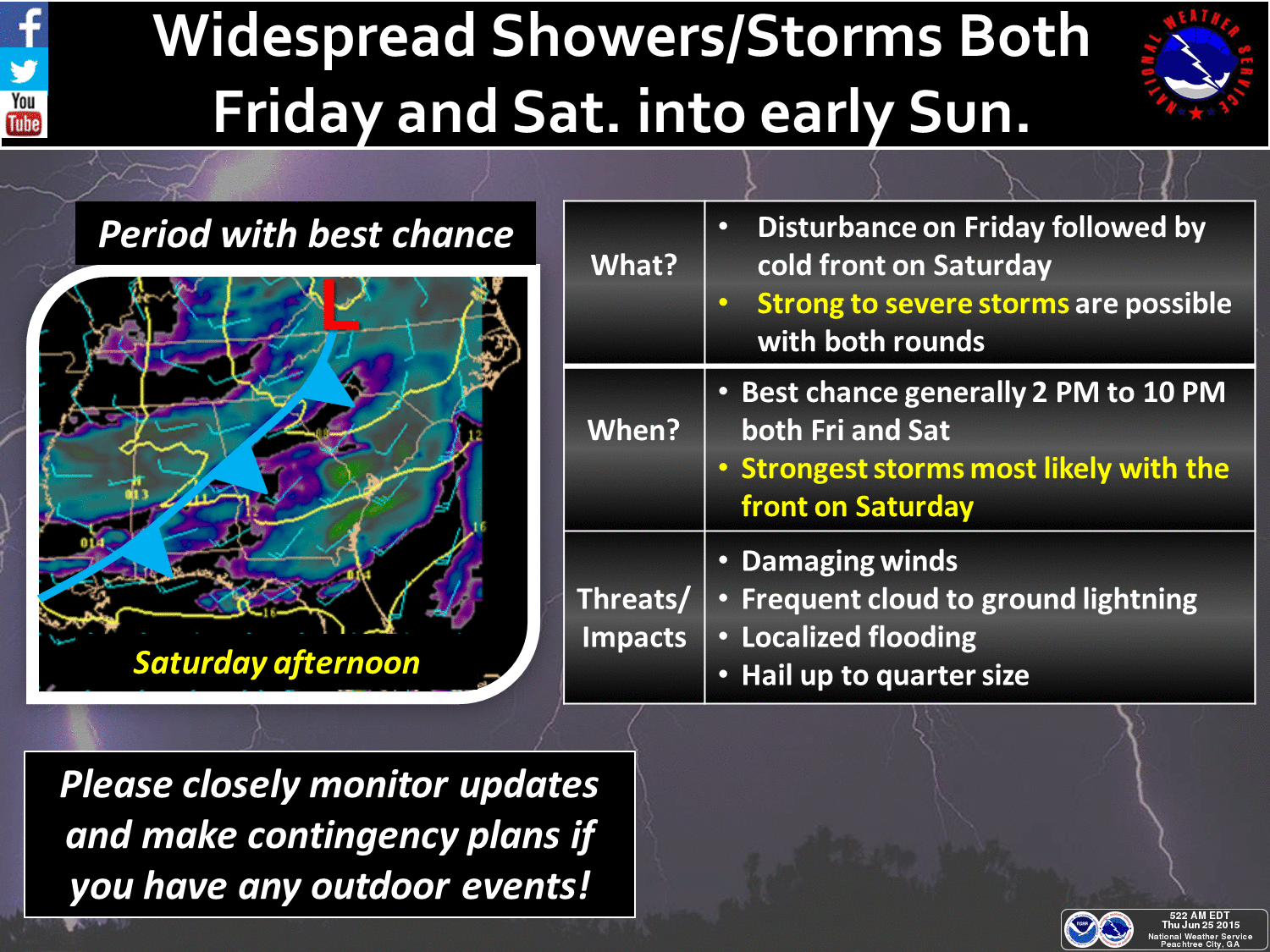 The National Weather Service in Peachtree City suggests you make contingency plans if you have any outdoors plans this weekend.