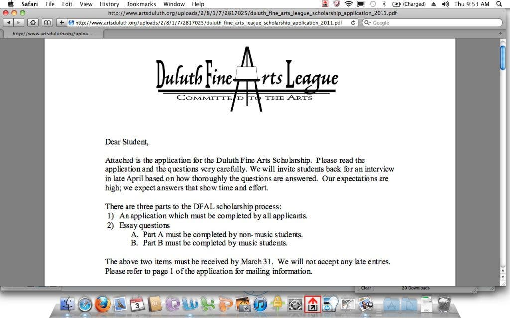 The Duluth Fine Arts League (DFAL) is providing two $1,000 scholarships to Duluth students planning to pursue careers in the fine arts. Applicants must be seniors enrolled at Duluth High School or home-schooled within the city limits of Duluth, according to Mary Buck, chairman of the DFAL Scholarship Committee.