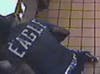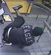 The robber wore a black ski mask and a black t-shirt that says "EAGLE" in large letters on the back. He wore dark colored cargo shorts and gray and black tennis shoes.