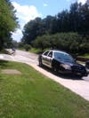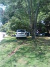 A Jeep was not able to stop in time and bounced over the tree and into the yard of Marvin Boaz, barely missing a large tree in his yard.