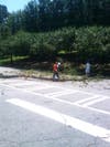 Several neighbors worked together to move the tree to the side of the road so traffic could pass through.