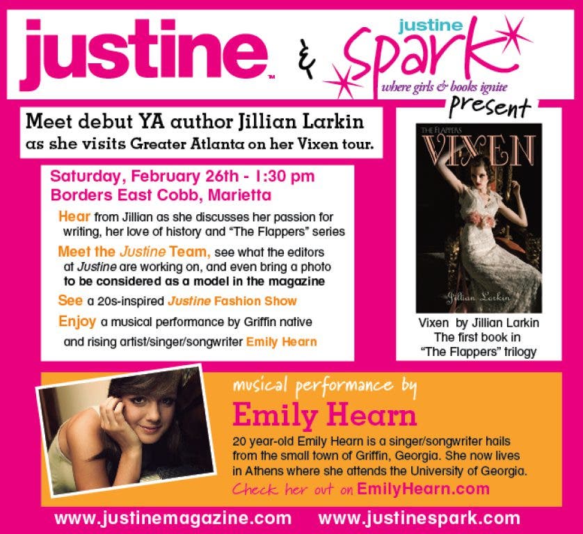 Meet 22-year-old debut author Jillian Larkin, the author of The Flappers series, as she visits Atlanta promoting Vixen and hear great music from rising singer/songwriter and Griffin, GA native Emily Hearn at this fun teen event! Jillian will discuss Vixen (her novel about 3 teen girls set in the Roaring Twenties), her passion for writing & her writing plans for the future. Sponsored by Justine Magazine, this event at Borders East Cobb will also feature a 20s inspired fashion show and great giveaways.