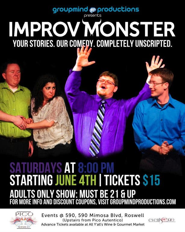 ATLANTA (May 3, 2011)- For two years, IMPROV MONSTER has proven itself one of Atlanta’s most innovative improv comedy shows, with a veteran cast performing every week at Midtown’s Relapse Theatre. Now Groupmind Productions is taking IMPROV MONSTER outside the perimeter, with a weekly show on Saturdays at 8pm starting June 4th in the Events @ 590 space, upstairs from Pico Autentico and All Y’alls Wine & Gourmet Market in historic Roswell. Unlike other improv shows, in which the audience provides a one-word suggestion to inspire a scene, IMPROV MONSTER uses true stories from audience members (or special guests) as the source for its character-driven storytelling. “They don't literally act out the stories, but draw on little details, turns of phrase or overall themes as springboards,” said Curt Holman of Creative Loafing, who described the show as having “classic sketch comedy structure, despite being off the cuff.” IMPROV MONSTER is the first of several improv shows Groupmind Productions plans to bring to sophisticated OTP audiences. Combining professionalism and class with healthy doses of wit and whimsy, the company is dedicated to spreading the wonders of Chicago- and San Francisco-style long-form improv comedy throughout the metro Atlanta area.