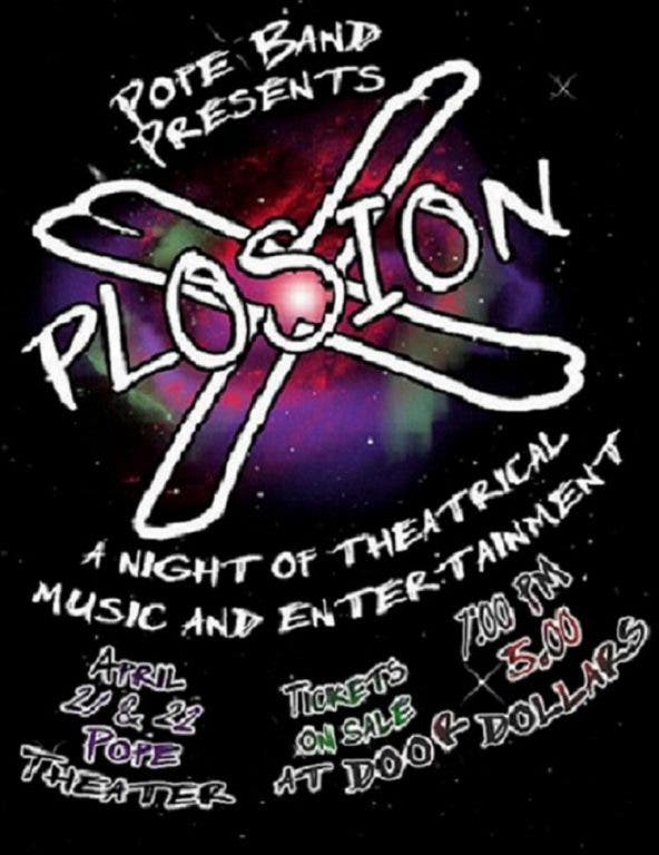 Pope Band presents XPlosion, a night of theatrical music and entertaiment! 7:00pm in the theater. Tickets are $5 on sale at the door.