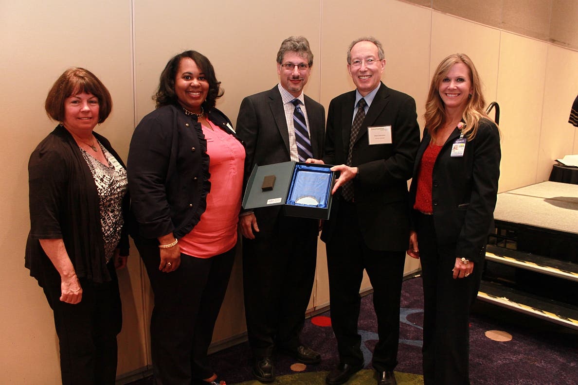Photo: Walt Orenstein presented an award to WellStar Health System representatives for their efforts to create healthier families through immunizations. From left: WellStar nurses Janet Beard, RN, Kia Redwine, RN, Sam Gold, M.D., pediatric committee on safety and quality chair, Walt Orenstein, the award’s namesake, and Ivy Spencer, RN.
