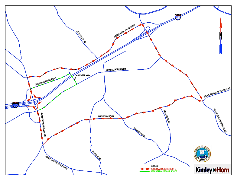 The bridge will be closed to all through-traffic during the weekend, although construction will not impact right turn access to or from I-85. Drivers and pedestrians should take one of the planned detours detailed on www.gwinnettDDI.com.