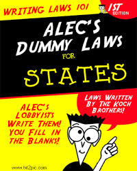 Did you ever notice how similar bills are sprouting up all over the country, synchronized like gas station prices, unannounced and unasked for by voters? If there's nothing sinister going on then why is their "model" legislation scrubbed from the ALEC web site? These used to be public. Why do they meet in secret, special places to "educate" our legislators? They recently held their national meeting in DC but all free press was disinvited while lobby firms like Heritage and the American Enterprise Institute were welcome to set up shop.