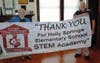 Students at Holly Springs Elementary School STEM Academy signed a banner for Superintendent of Schools Dr. Frank R. Petruzielo to thank him for their schoolβs new designation this year as a STEM Academy.Β The 963 students celebrated their Spring STEM Expo with an βAttitude of Gratitudeβ regarding the excitement and new opportunities they have had as a result of the schoolβs STEM designation.Β Principal Dr. Dianne Steinbeck, left, presents Dr. Petruzielo with the banner signed by all of schoolβs students.
