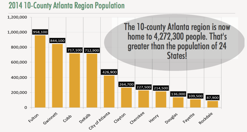 The 10-county Atlanta region added more than 50,000 people between April 1, 2013 and April 1, 2014.