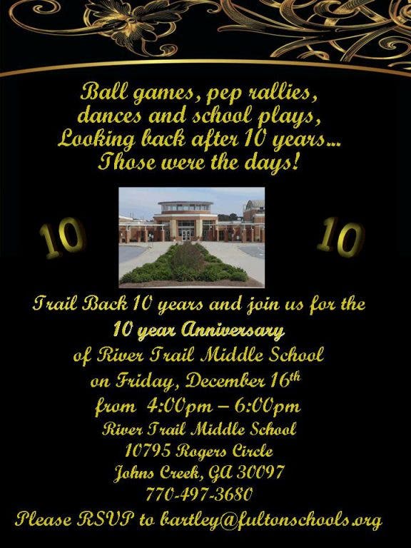 River Trail Middle School in Johns Creek invites all former students, as well as current and former faculty and staff, to “Trail Back 10” and attend its 10 Year Anniversary celebration.