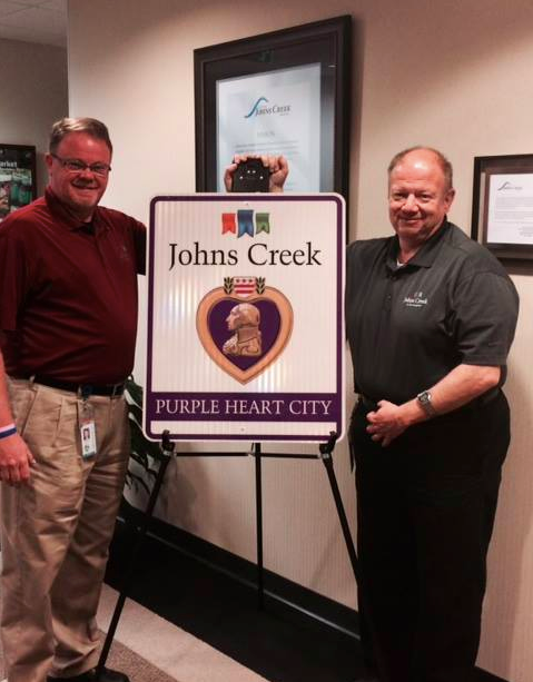 The City will erect Purple Heart City signs underneath existing ‘Welcome to Johns Creek’ signs at the city limits along major thoroughfares as part of the designation.