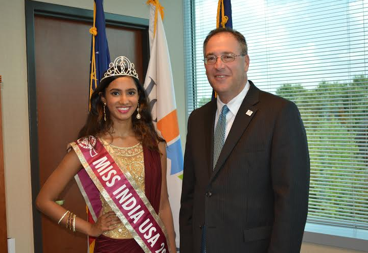 Photo: Pranathy Gangaraju, Miss India USA 2014, meets with Johns Creek Mayor Mike Bodker before departing for the Miss India Worldwide pageant in Mumbai on Sept. 5. Credit: city of Johns Creek
