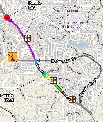These closings also will include side streets. Traffic from Twingate Drive will be allowed to enter and exit State Bridge Road in the direction of Medlock Bridge Road. (See parade map.)