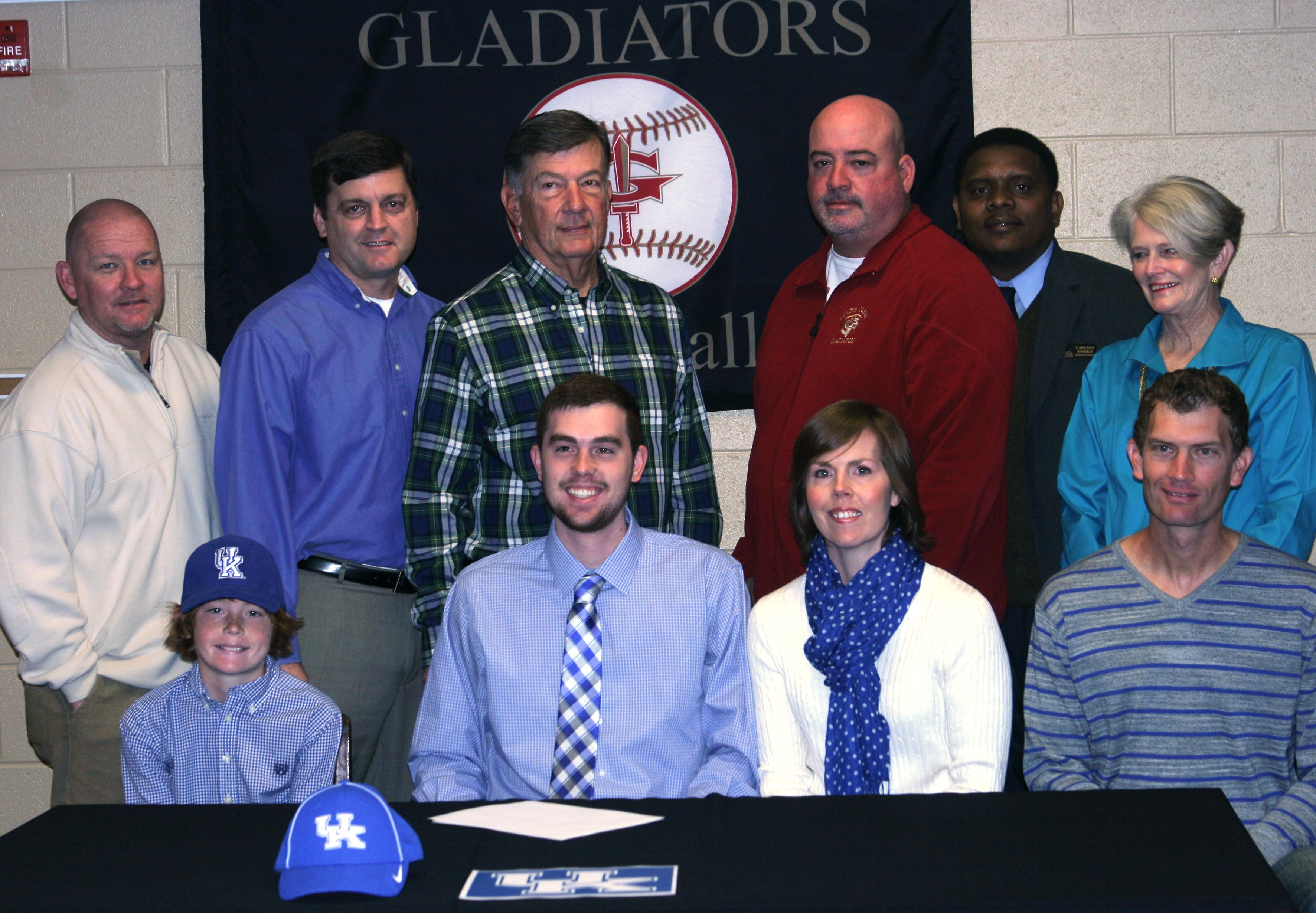 In front: Johns Creek High School senior, Gabe Moore signs his letter of intent as parents Shannon and Chris watch. In back are Baseball Coach Billy Nicholson, Pitching Coach Jim Poole, Grandfather George Moore, Assistant Athletic Director Steve Hall, Assistant Principal Carlton Harris, and Grandmother Ann Moore.