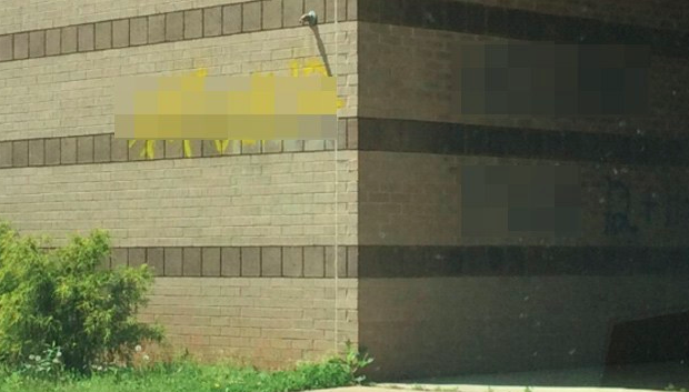 According to the news station, custodians spent the better part of Sunday cleaning up the graffiti spray painted in blue and yellow, which appear to be the school’s colors.