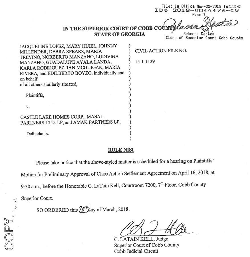 Lopez et al v. Castle Lake Homes Corp - Case 15-1-1129 (Cobb County Superior Court)