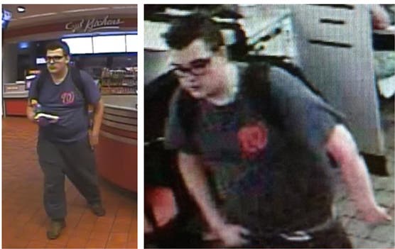 The suspect is described as a white male wearing eyeglasses, 20-25 years old, standing about 5'8" and weighing between 200-250 pounds. He has brown hair and was wearing a navy-colored Washington Nationals t-shirt, baggy black pants and dark shoes.