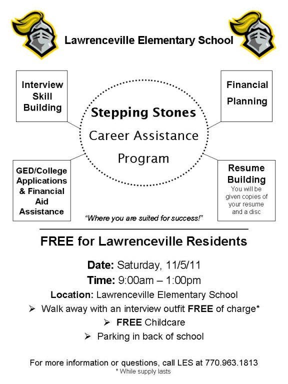 Stepping Stones Career Assistance Program will hold a kick-off event on Saturday, November 5 from 9:00 AM until 1:00 PM at Lawrenceville Elementary School, 122 Gwinnett Drive in Lawrenceville. Free parking and free child care will be available for those attending.