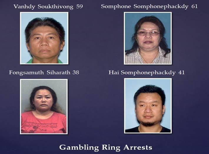 Vanhdy Soukthivong, 59, Somphone Somphonephackdy, 61, Fongsamuth Siharath, 38, and Hai Somphonephackdy, 41, were arrested on a total of six felonies for commercial gambling violations, three misdemeanors for counterfeit trademark violations and an alcohol license violation at the business.