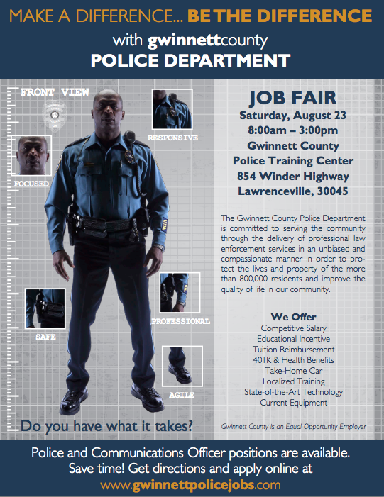 The Gwinnett Police Department will host a job fair on Saturday, Aug. 23 at its Police Training Center on Winder Highway in Lawrenceville.