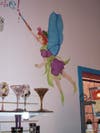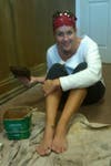 I paint with no shoes on. (She laughs) I paint barefoot. I climb up and down my ladders with no shoes on. I have two reasons for this. My first reason is I’m most comfortable with no shoes on .The other reason is that if I’m working on a ladder, I can grip my ladder with my toes cause I’m really short. I’m only 5’1”. So when I have to reach these taller places, I can get at the tip-top of the ladder and grab it with my toes and kind of hang on. And the most important one is if I step in paint, I’ll know it. And I’m not going to track it everywhere.