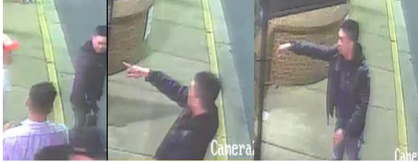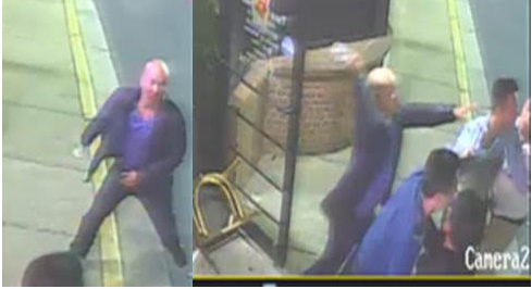 A second suspect is seen wearing a blue coat and blue shirt. During the fight, he attacked two victims with a glass mug or beer bottle, striking them in the head.